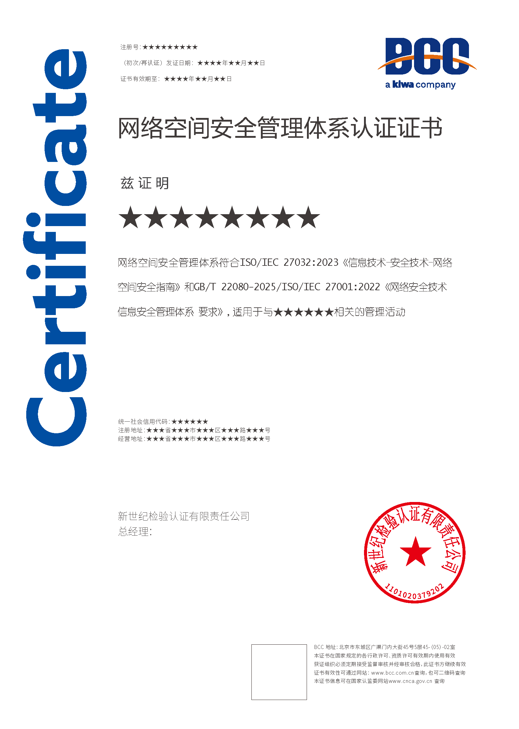 本頁涉及的認證服務(wù)中均有對應(yīng)的《認證實施規(guī)則》,BCC擁有其最終解釋權(quán)。任何組織及個人未經(jīng)BCC許可,不得以任何形式全部或部分使用(法律要求除外)認證相關(guān)信息。如需獲取相關(guān)實施規(guī)則請用以下方式聯(lián)系獲取:電話:010-58579316   郵箱:fwjs@kiwa.cn