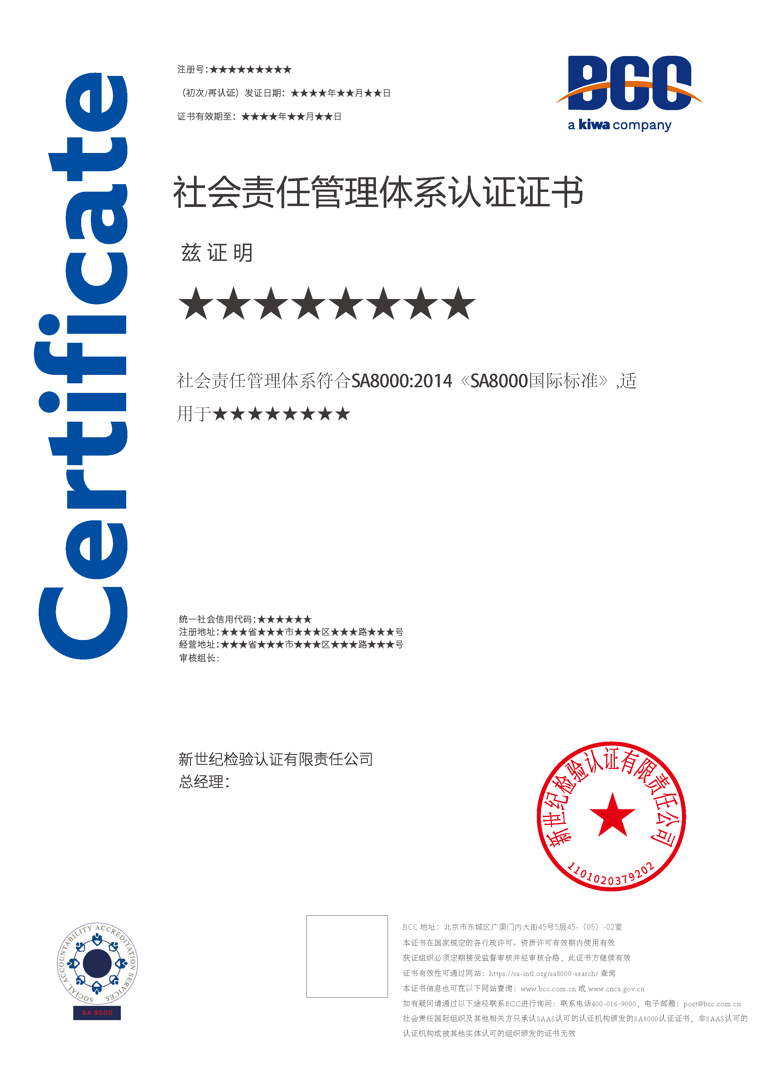 現(xiàn)行SA8000認(rèn)證使用的標(biāo)準(zhǔn)是SA8000:2014,該標(biāo)準(zhǔn)是由美國SAI(社會責(zé)任國際組織)制定發(fā)布的。SA8000標(biāo)準(zhǔn)涵蓋九個方面:童工、強(qiáng)迫勞動、健康與安全、結(jié)社自由及集體談判的權(quán)利、歧視、懲罰措施、工作時(shí)間、報(bào)酬和管理體系。