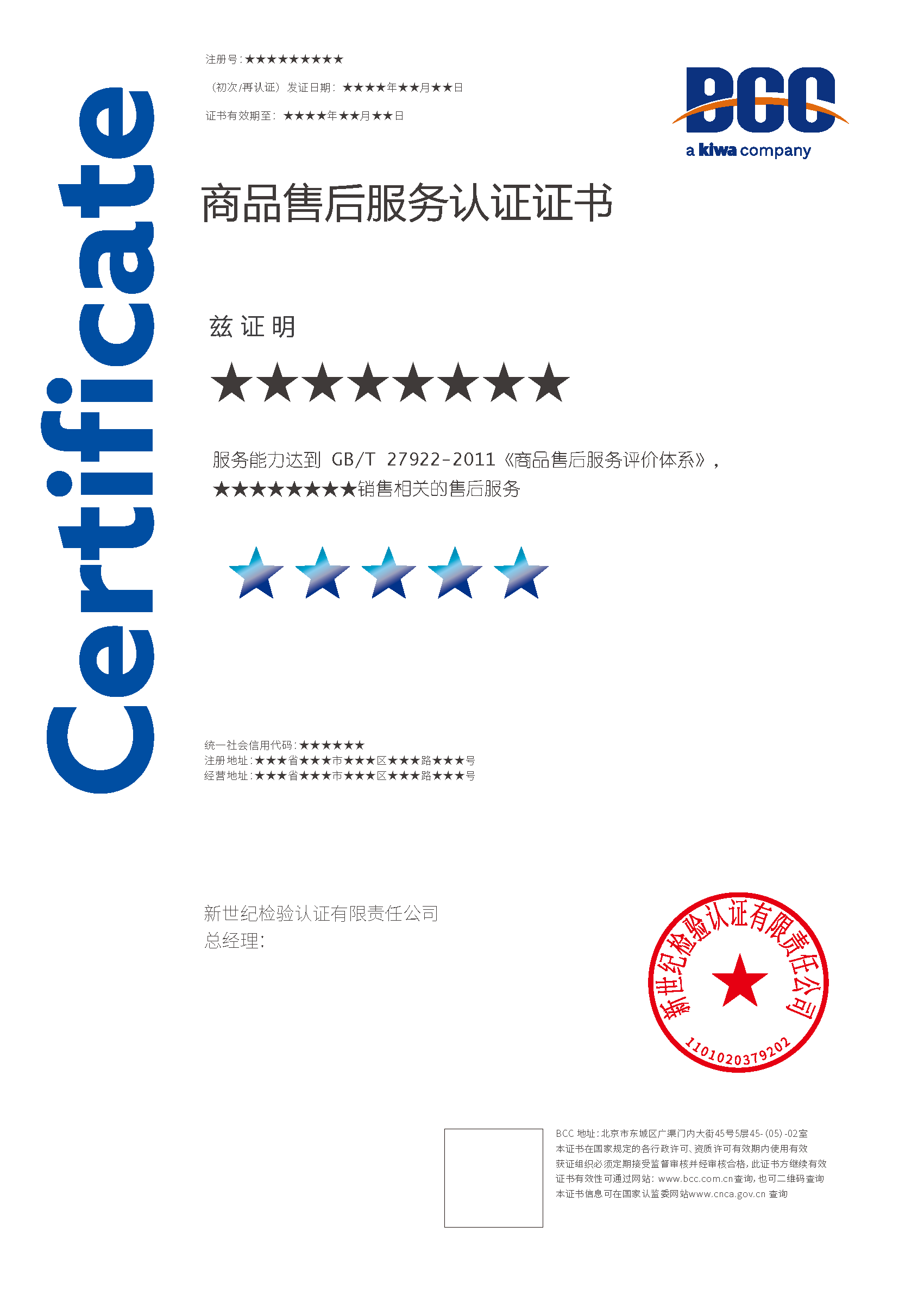 本頁(yè)涉及的認(rèn)證服務(wù)中均有對(duì)應(yīng)的《認(rèn)證實(shí)施規(guī)則》,BCC擁有其最終解釋權(quán)。任何組織及個(gè)人未經(jīng)BCC許可,不得以任何形式全部或部分使用(法律要求除外)認(rèn)證相關(guān)信息。如需獲取相關(guān)實(shí)施規(guī)則請(qǐng)用以下方式聯(lián)系獲取:電話:010-58579316 郵箱:fwjs@kiwa.cn