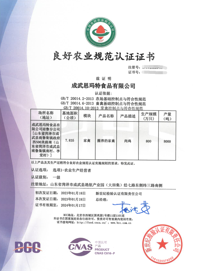 讓雞肉產(chǎn)品更具競(jìng)爭力!成武思瑪特通過BCC實(shí)施的GAP(家禽模塊)認(rèn)證