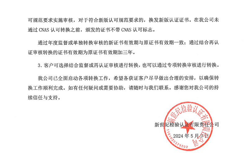 2.2024年6月1日起,我公司不再實施基于舊版認可規(guī)范的審核,開始按照新版認可規(guī)范要求實施審核,對于符合新版認可規(guī)范要求的,換發(fā)新版認證證書。在我公司未通過CNAS認可轉(zhuǎn)換之前,頒發(fā)的證書不帶CNAS認可標志。