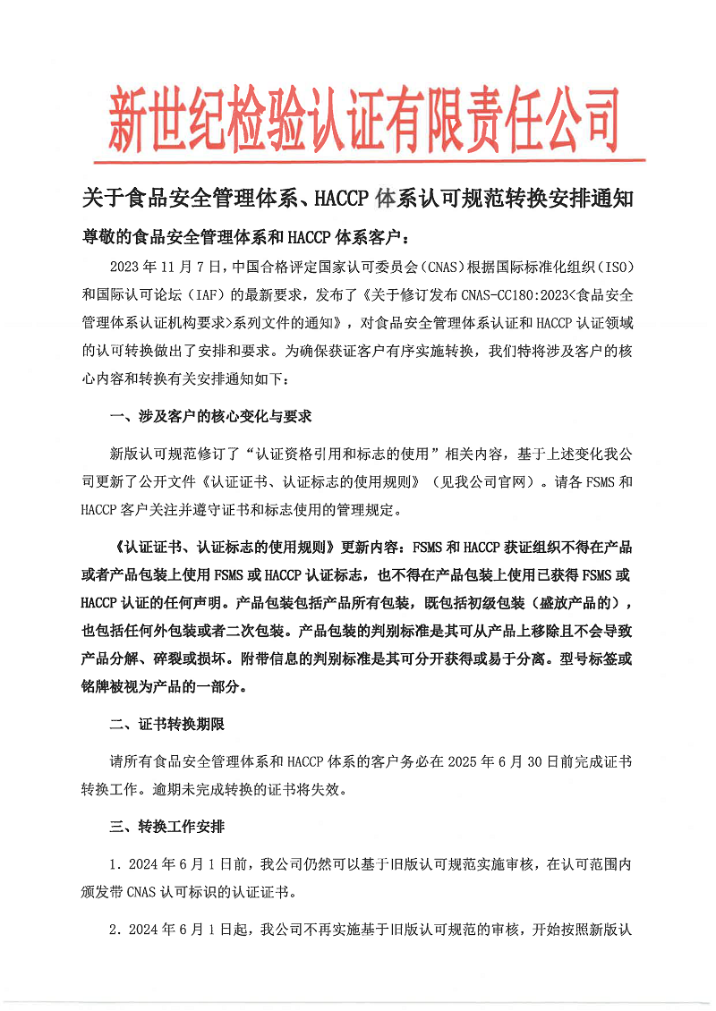 2023年11月7日,中國合格評定國家認可委員會(CNAS)根據(jù)國際標準化組織(ISO)和國際認可論壇(IAF)的最新要求,發(fā)布了《關(guān)于修訂發(fā)布CNAS-CC180:2023<食品安全管理體系認證機構(gòu)要求>系列文件的通知》,對食品安全管理體系認證和HACCP認證領(lǐng)域的認可轉(zhuǎn)換做出了安排和要求。為確保獲證客戶有序?qū)嵤┺D(zhuǎn)換,我們特將涉及客戶的核心內(nèi)容和轉(zhuǎn)換有關(guān)安排通知如下: