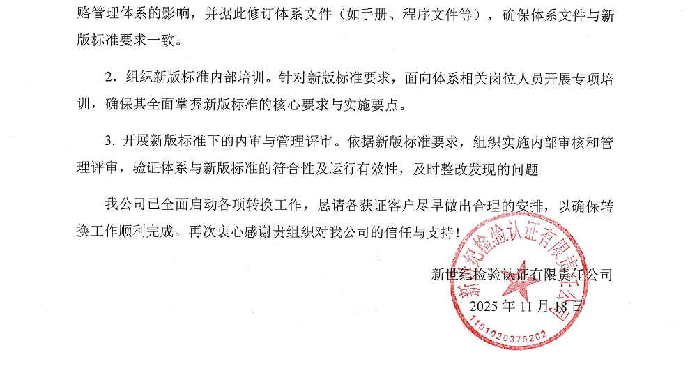 1.2025年11月18日起,我公司開始受理新版標(biāo)準(zhǔn)的申請(包括初審、再認(rèn)證+轉(zhuǎn)換、監(jiān)督+轉(zhuǎn)換、專項(xiàng)轉(zhuǎn)換),對于符合新版標(biāo)準(zhǔn)要求的,換發(fā)新版標(biāo)準(zhǔn)認(rèn)證證書。通過年度監(jiān)督和單獨(dú)換版審核的新證書有效期與原證書有效期一致,通過再認(rèn)證審核的證書有效期為3年。