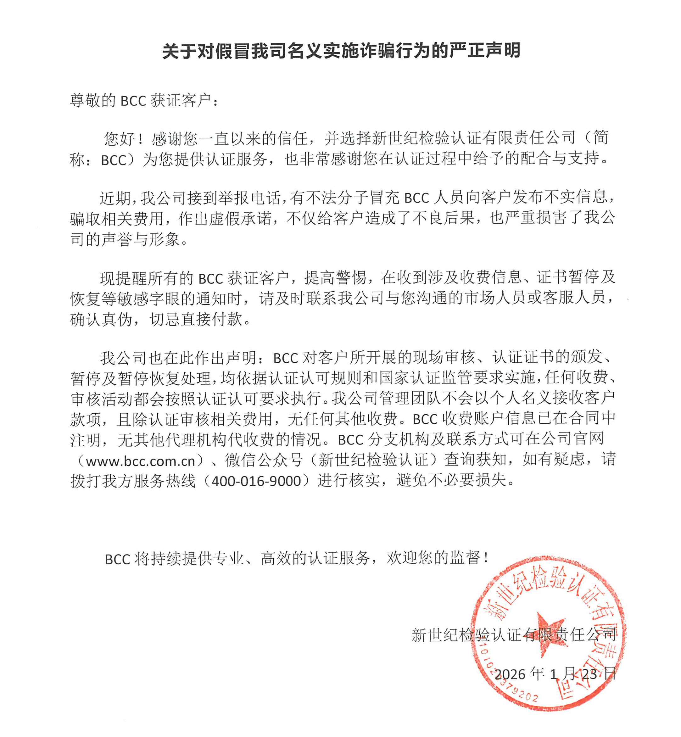 我公司也在此作出聲明:BCC對客戶所開展的現(xiàn)場審核、認證證書的頒發(fā)、暫停及暫?;謴吞幚恚罁?jù)認證認可規(guī)則和國家認證監(jiān)管要求實施,任何收費、審核活動都會按照認證認可要求執(zhí)行。我公司管理團隊不會以個人名義接收客戶款項,且除認證審核相關費用,無任何其他收費。BCC收費賬戶信息已在合同中注明,無其他代理機構代收費的情況。BCC分支機構及聯(lián)系方式可在公司官網(wǎng)(www.ksyihe.com)、微信公眾號(新世紀檢驗認證)查詢獲知,如有疑慮,請撥打我方服務熱線(400-016-9000)進行核實,避免不必要損失。